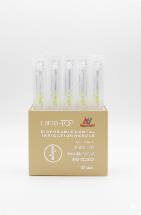 إبر الريّ ENDO-TOP هي أدوات علاج جذور أسنان فائقة الجودة، مصممة لتوصيل محاليل الريّ إلى نظام قناة الجذر بأمان وفعالية. تتميز هذه الإبر بتصميمها ذي الفتحة الجانبية والطرف المغلق، مما يمنع خطر تسرب محاليل الريّ، مثل هيبوكلوريت الصوديوم (NaOCl) أو EDTA، إلى قمة الجذر. يحمي الطرف المستدير المغلق أنسجة قمة الجذر الحساسة، بينما تضمن الفتحة الجانبية تنظيفًا جانبيًا شاملًا لجدران القناة والتعقيدات التشريحية.