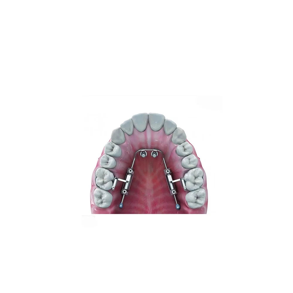 Fixed orthodontic appliance for molar distalization with controlled force application.