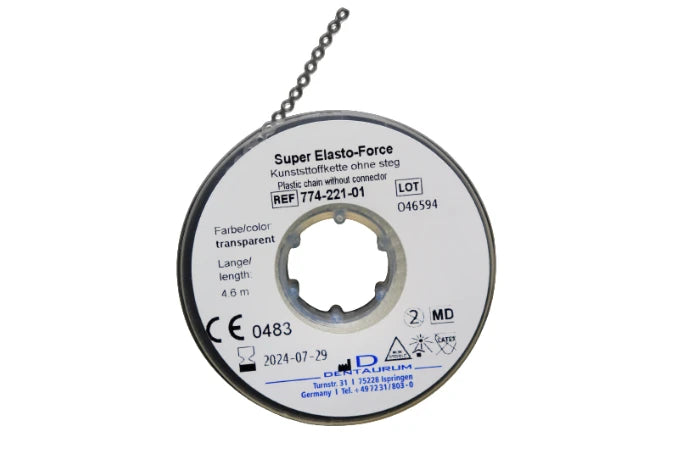 Elastic memory chain used in orthodontic treatment for consistent force application during space closure and tooth movement. Radiopaque and suitable for posterior use.